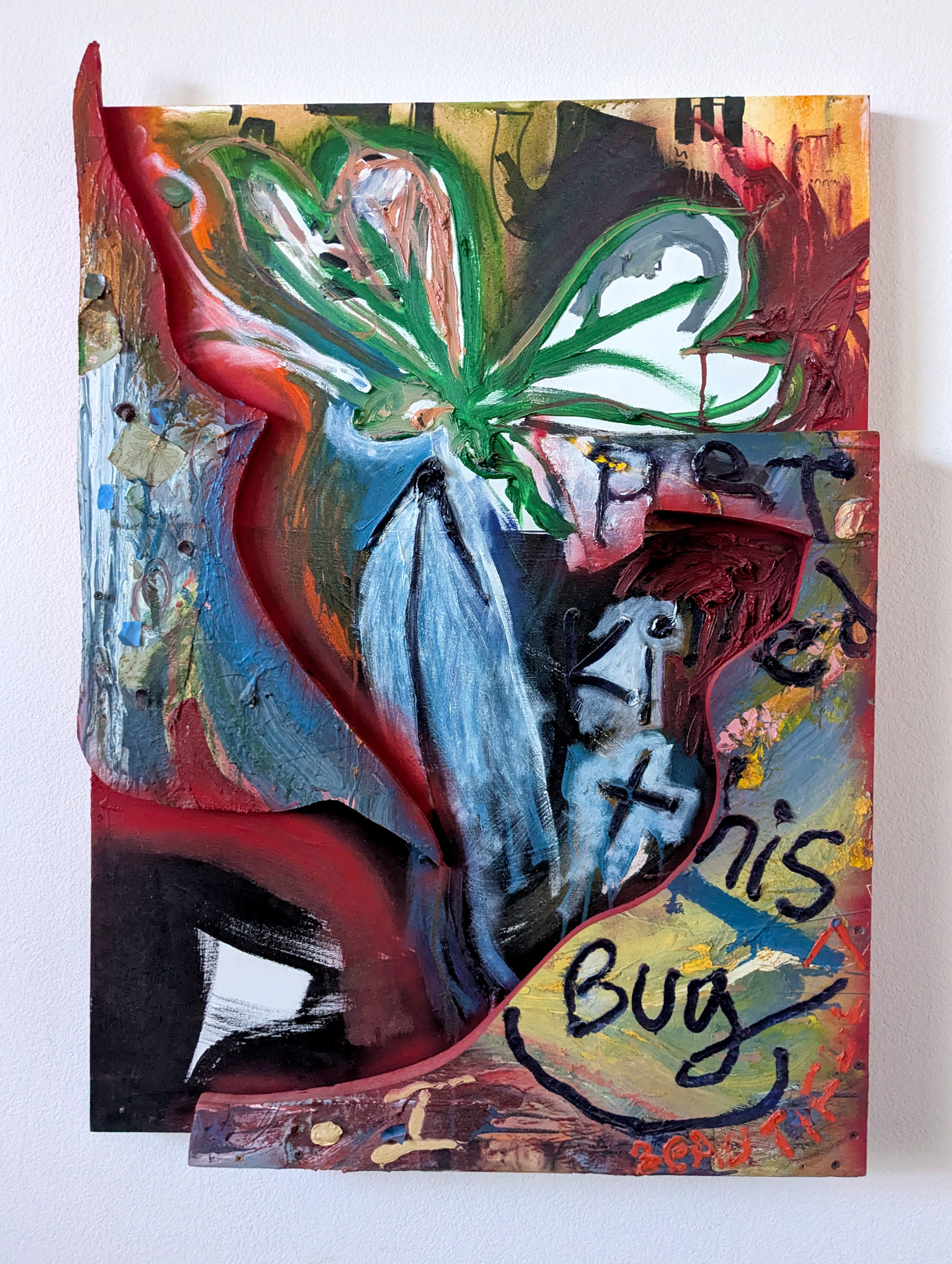 Bug, oil, acrylic, spray paint, ink, fabric, screws, tape, wood on canvas