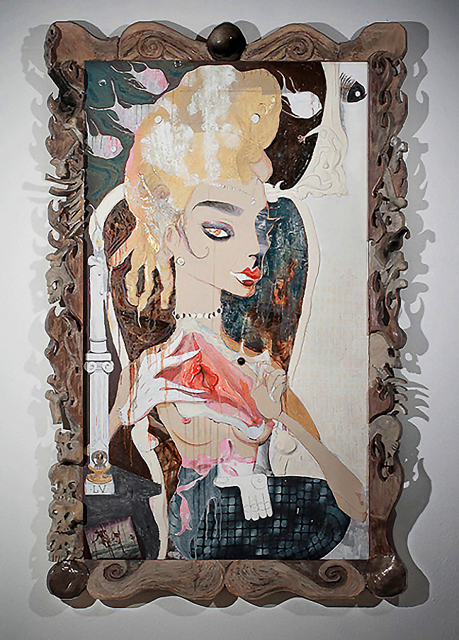 Oil, acrylic, graphite, photo collage, plaster, bone, resin on wood with carved wood frame