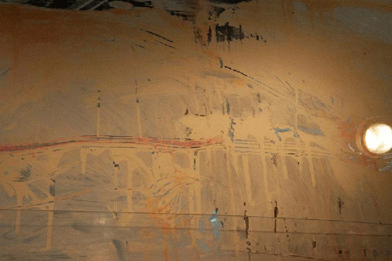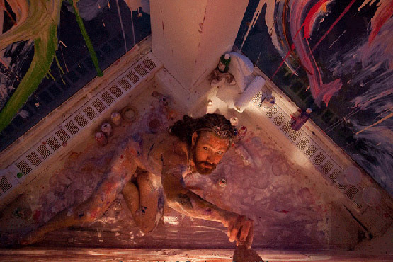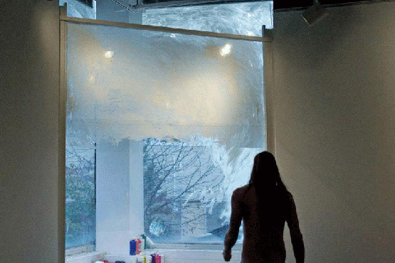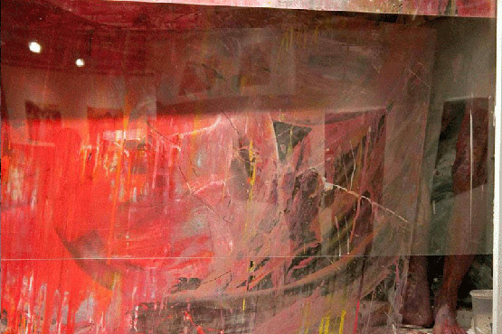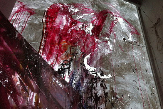 By placing myself behind a sheet of Plexiglas I hope to explore meanings and conceptions of performance versus painting. Paint will be moved across the transparent canvas with gestural movements, applied by the body. I plan to begin with the clear surface covered in white, "blank." Little by little more paint and color will be added, removed, dripped, pressed or flung across, eaten... Compositions will change during the three hours I project to create and will be dictated as I view it from my reversed perspective.