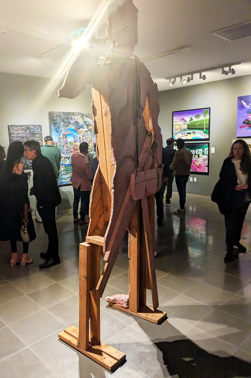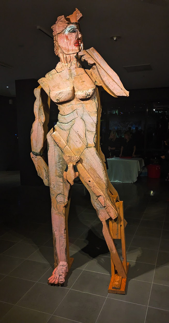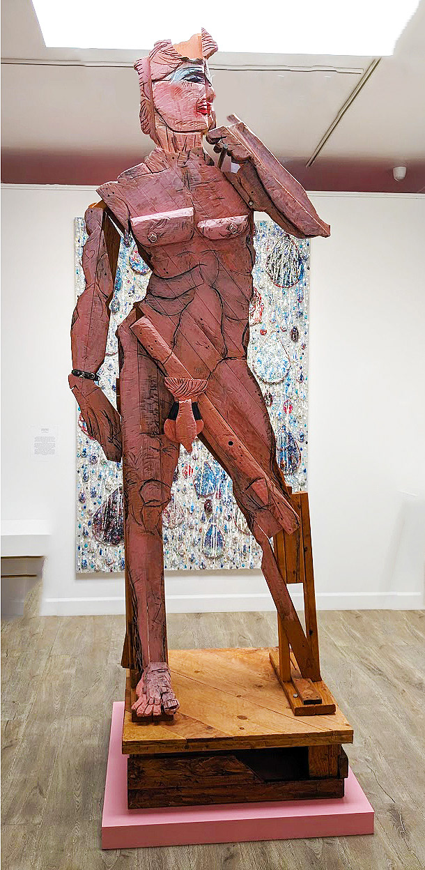 Latex, spray paint, wood stain, charcoal, leather, rubber, metal jewelry on carved wood