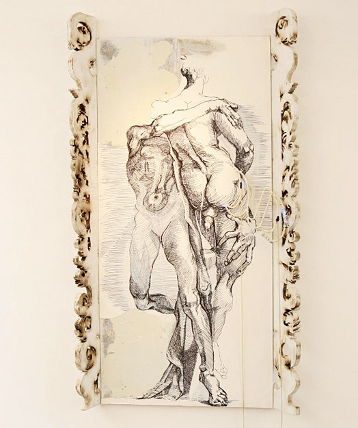 Ink, acrylic on paper mounted on wood; carved, burned wood frame with latex; neon, wire, transformer