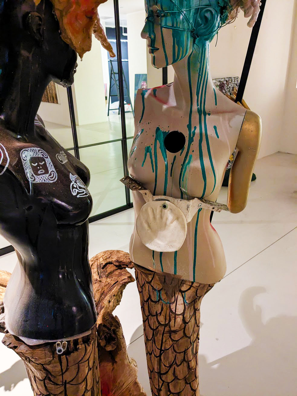 Mannequins originally created for displaying fashion garments upon "ideal" female bodies are strategically devastated by rough-bored holes at sensitive perceptual areas of the human body such as eyes, ear, heart, mind, etc. exposing cavities rendered as empty interiors of each fiberglass doll.