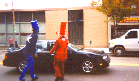 Day 1 - Aaron Sheppard, dressed in blue, and Tzanko Tchangov, in red, walked the streets of Peekskill, knocked on doors and entered establishments in search of voter support. Milk crates were used as portable "soap boxes". Each passed out identical propaganda on colored fliers and stickers respective of their party's color: "CHOOSE your allegiance; BELIEVE in us; FIGHT for freedom". "Vote for US, not for THEM!" was the slogan heard across this land. Fellow Americans wore stickers of their chosen party to show their support.