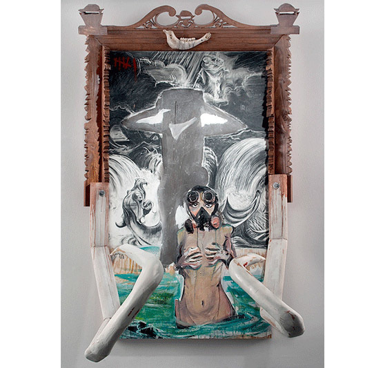 Sometime in June of 2009, amid a very strong group show,Western Project exhibited two paintings by a just-discovered Aaron Sheppard. The paintings exuded a kind ofmagnetism that locked viewers in their sight lines: lessthe shock of novelty than rediscovery - an uncannilyfamiliar, yet slightly archaic, mannerist representation-al style, tinged with qualities both visionary and explicitly, almost appetizingly carnal, as well as a distinct satirical edge.A year and a half after his Debutante's Eclipse (one ofthe paintings that got everyone's attention), Sheppard'sdebut solo show throws the viewer into a host of newissues, obsessions, media and materials. If Sheppard'sfirst Debutante presented us with a glistening vulvanot unlike, as I wrote at the time, "the wound ofAmfortas in Syberberg's film of Parsifal, Yonic Inversion (the yoni is the stylized Hindu representation ofthe vulva) - gives us its inverse in a myriad of incarnations and an expansive range of media and materials.With his first paintings, Sheppard worked the framesthemselves into elaborations and extensions of theirsubjects. Here, he expands beyond the frame and beyondpainting into a show of collage and assemblage thatpushes his visionary theater to the edge and sometimesover it.